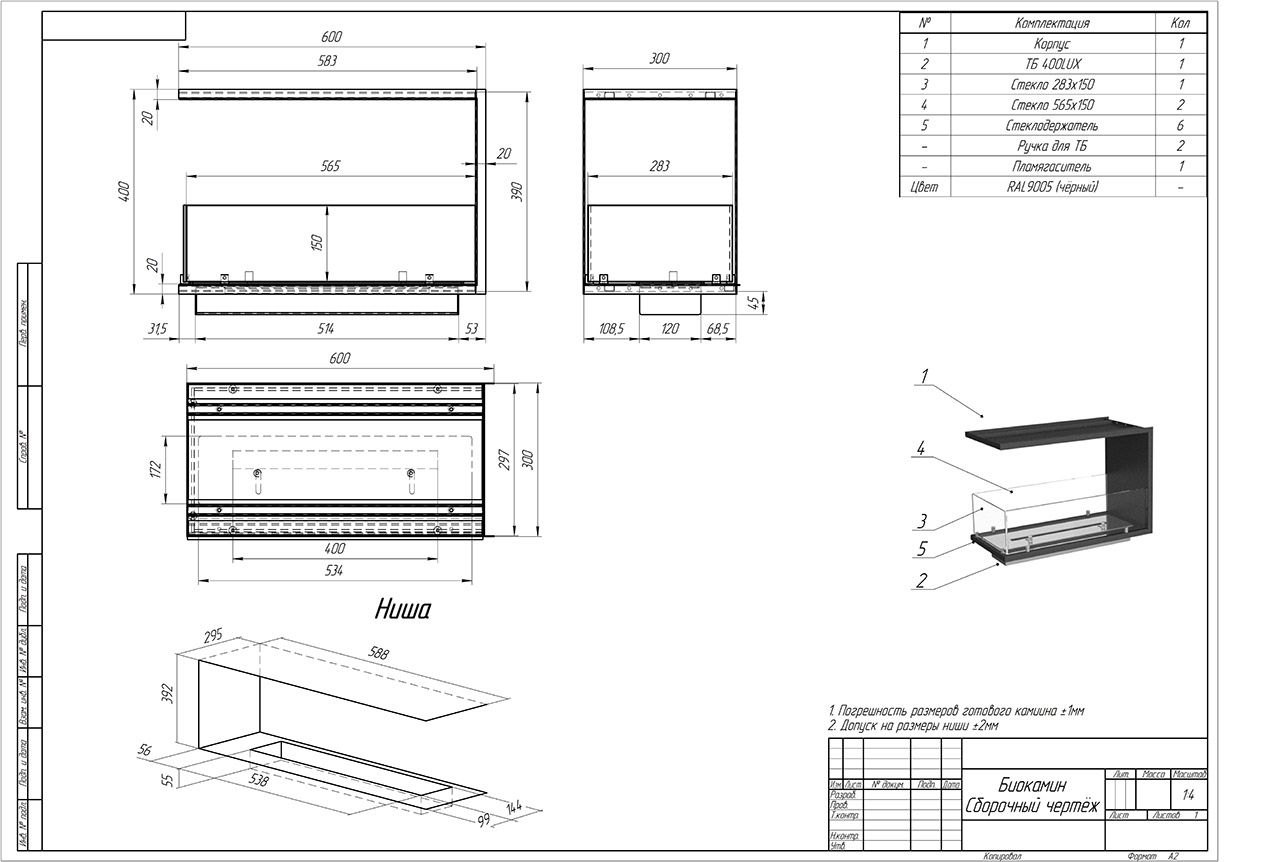 Корпус Материал Корпус Сталь в огнеупорной краске Тощина металла Корпус 2-3мм Длинна 600мм Высота 400мм Глубина 300мм Топливный блок Тип Lux Тип управления Мануальный (Ручной) (Д x В x Г) 534х172х63 Тощина металла ТБ 3мм Материал ТБ Нержавеющая сталь Линия огня 40см Время горения (полный) 3ч Максимальный объем 2л Минимальный объем 0.6л Время горения, л/ч 0.65л Минимальная площадь помещения 13м² Комплектация Стекло 3шт Стеклодержатель 6шт Корпус биокамина 1in Топливный блок 1шт Пламегаситель 1шт Ручка для шторки 2шт Зажигалка 1шт Биотопливо 1шт Руководство по эксплуатации 1шт Информация о товаре Вес: 17кг ДxВxГ: 600мм x 400мм x 300мм -