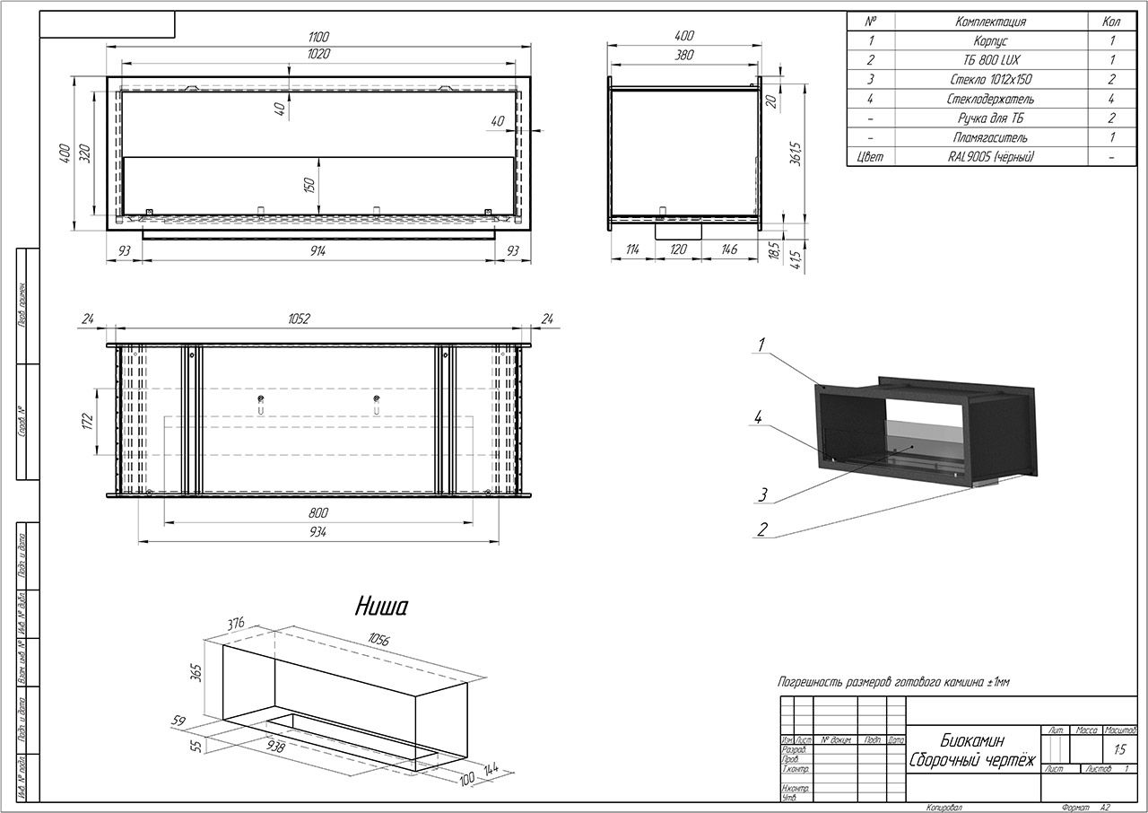 Корпус Материал Корпус Сталь в огнеупорной краске / стекло Тощина металла Корпус 2мм Длинна 1100мм Высота 400мм Глубина 400мм Топливный блок Тип Lux Тип управления Мануальный (Ручной) (Д x В x Г) 934х172х63 Тощина металла ТБ 3мм Материал ТБ Нержавеющая сталь Линия огня 80см Время горения (полный) 3ч Максимальный объем 4л Минимальный объем 1.2л Время горения, л/ч 1.1л Минимальная площадь помещения 27м² Комплектация Стекло 2шт Стеклодержатель 4шт Корпус биокамина 1шт Топливный блок 1шт Пламегаситель 1шт Ручка для шторки 1шт Зажигалка 1шт Биотопливо 2л Руководство по эксплуатации 1шт Информация о товаре Вес: 32кг ДxВxГ: 1100мм x 400мм x 400мм -