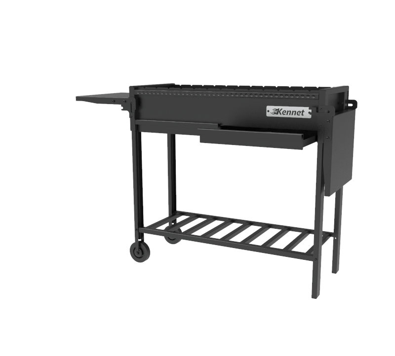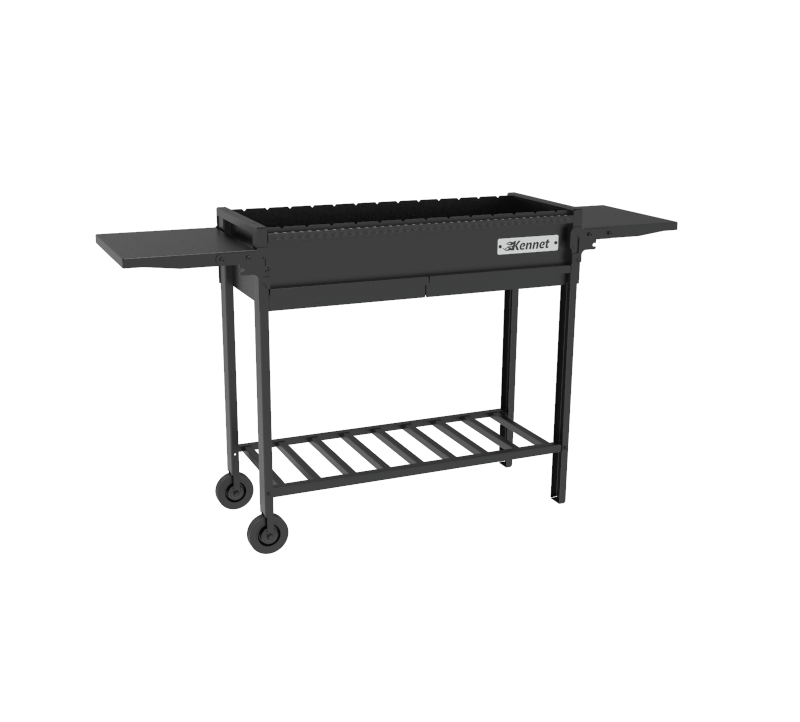 Передвижной мангал с 2-мя боковыми полками предназначен для приготовления мяса, птицы, рыбы, овощей на открытом воздухе с использованием древесного угля или дров.