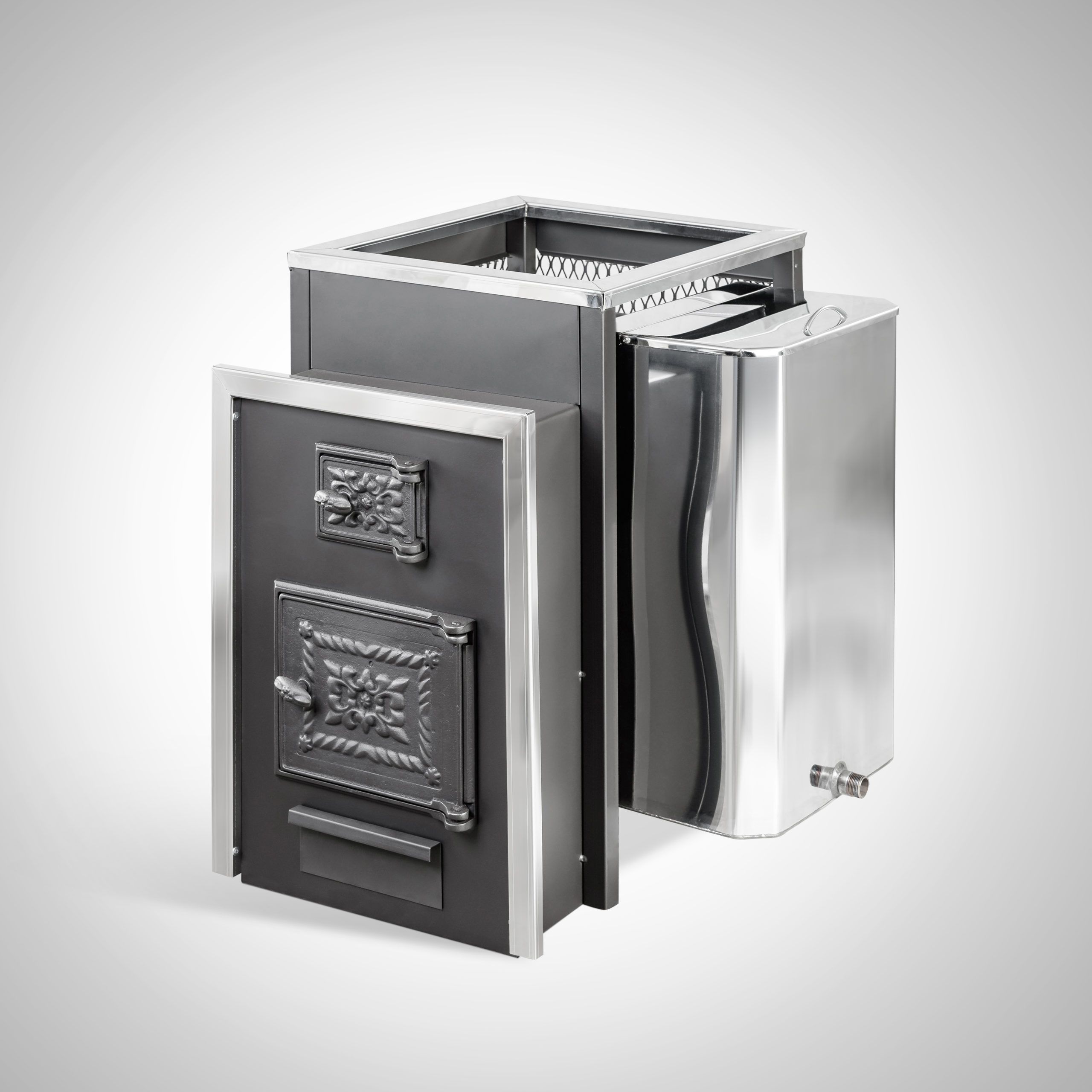 Внимание! Баки, теплообменники, топочные дверки со стеклом, элементы дымохода и камни приобретаются отдельно, в комплект печи не входят.