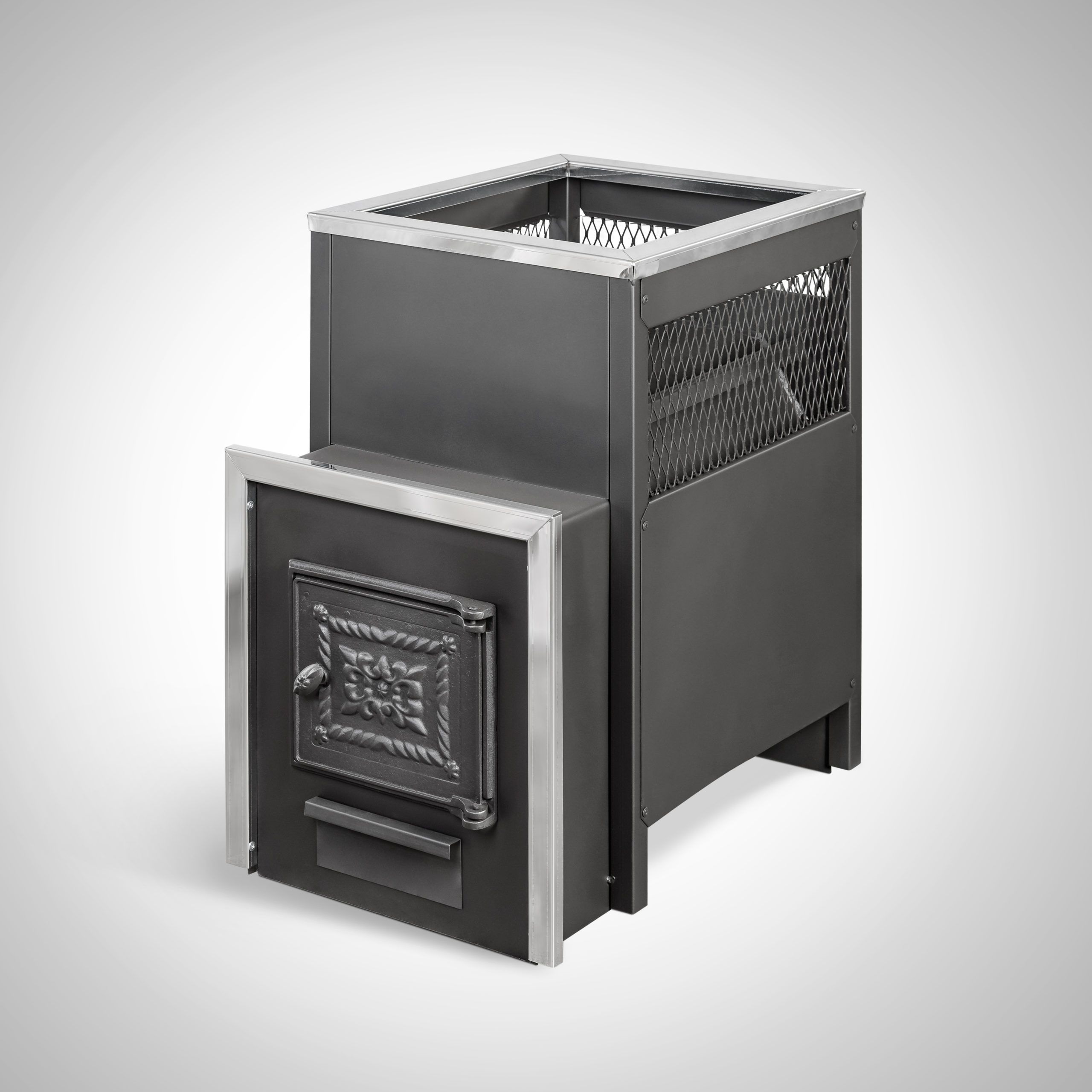 Печь предназначена для бань и парных средних размеров. Высокую динамику нагрева парильного помещения обеспечивает конструкция дымохода. Вместительная вентилируемая каменка открытого типа является мощным парогенератором. Конвекционный кожух печи способствует циркуляции воздуха, экранирует жесткое инфракрасное излучение от раскаленных стенок топки. Кожух съемный. После демонтажа стенки кожуха (справа, слева, сзади) можно удобно и надежно навесить бак объемом 45 литров. Рекомендуем устанавливать бак на заднюю стенку печи, чтобы обеспечить наиболее быстрый нагрев воды.