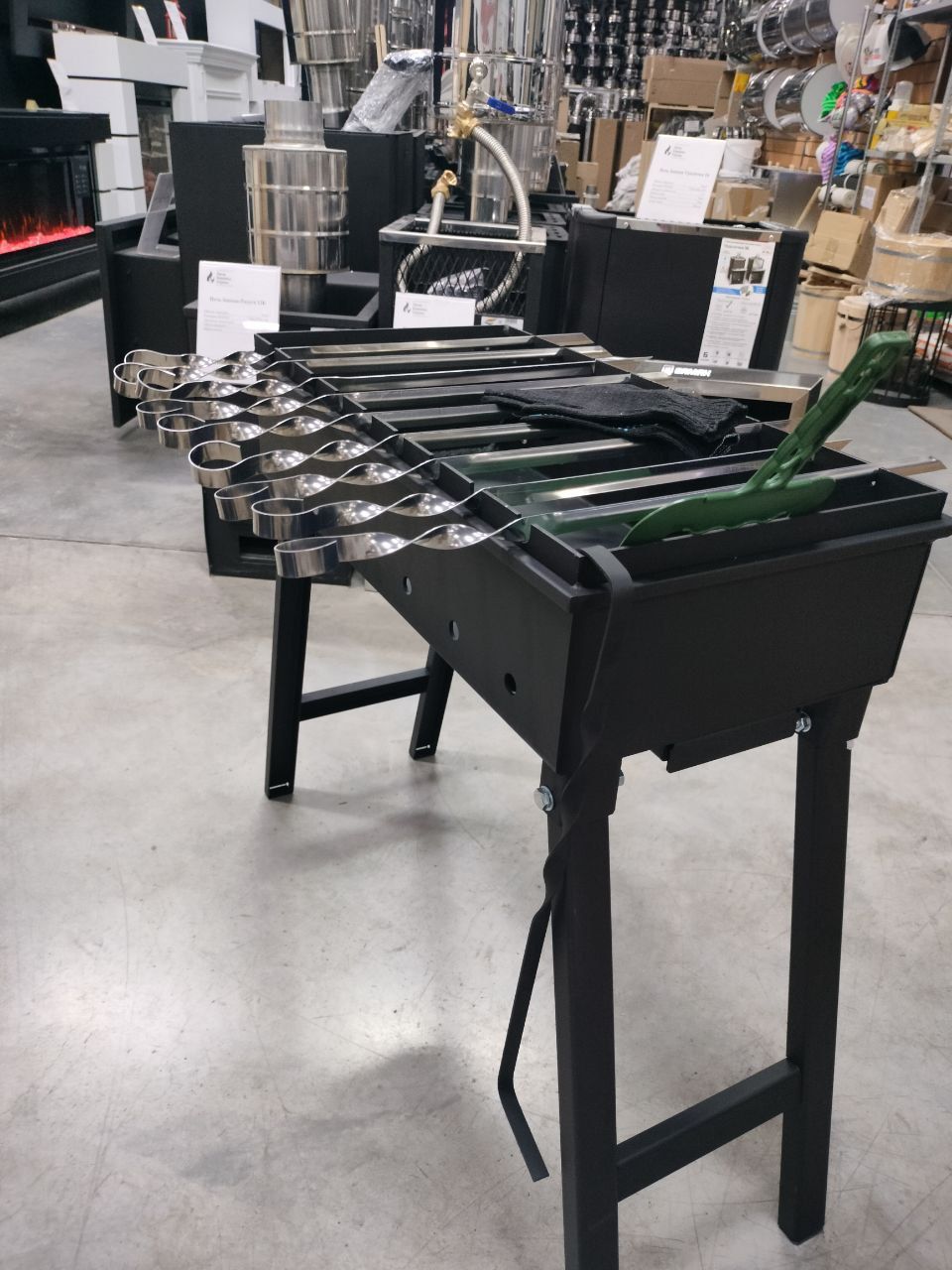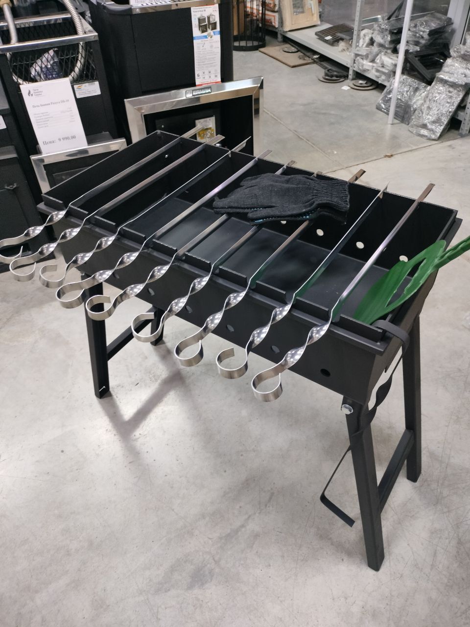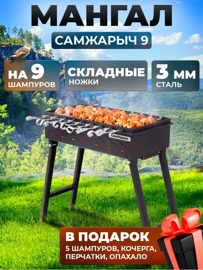 в подарок кочерга - 1 шт, шампура для мангала - 9 шт, опахало - 1 шт и перчатки - 1 пара.
